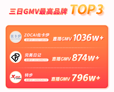 销售金额前三被佐卡伊、完美日记和特步夺得,GMV分别超过1036万、874万和796万。