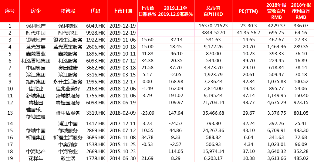 相信随着保利、时代邻里等公司的上市,有望会给2019年港股物业板块添上最后一抹亮色,毕竟连一贯青睐互联网独角兽的高瓴也做了保利基石;而2020年还会有大量优质的物业股陆续上市,比如万科、融创。